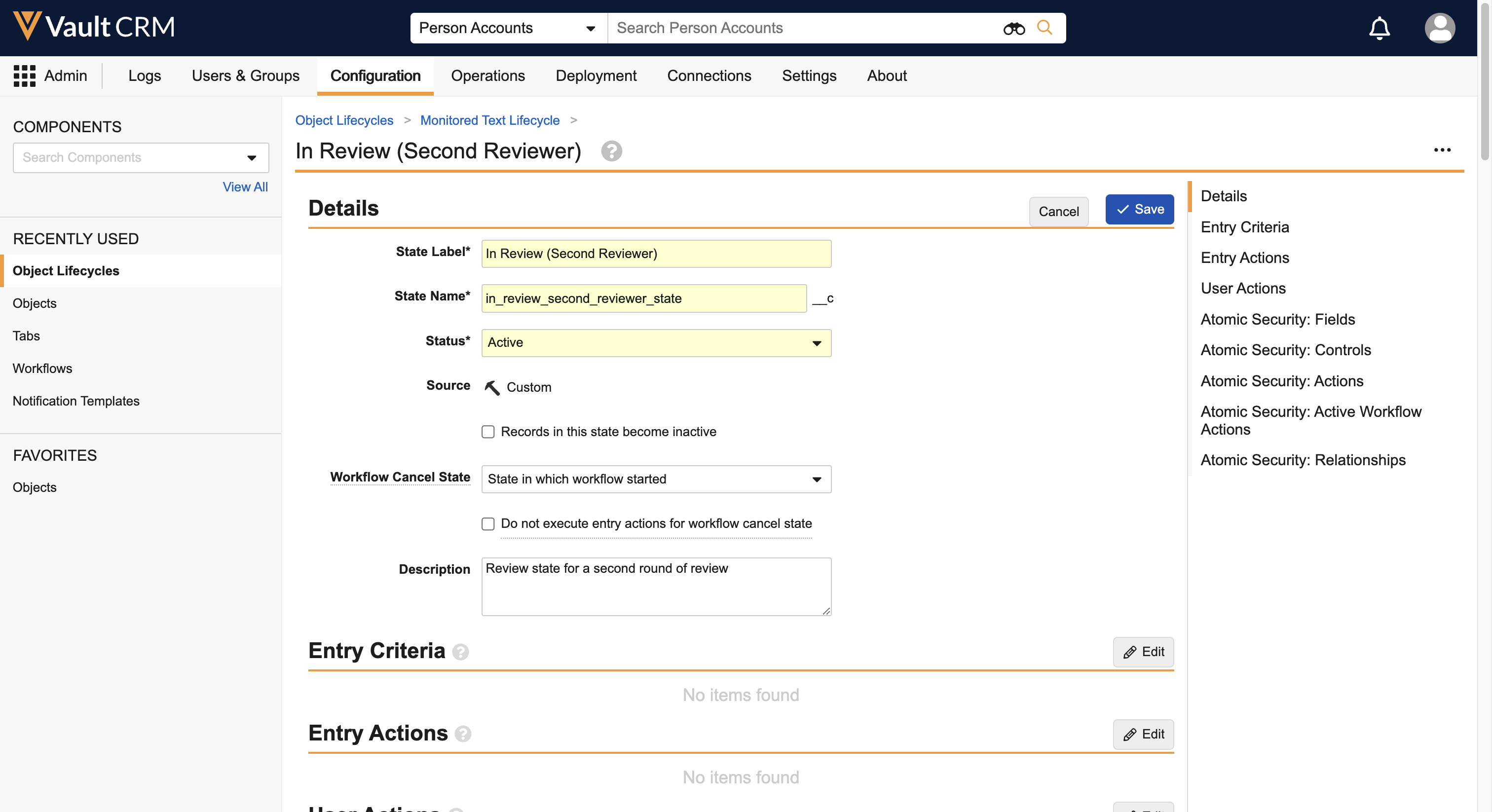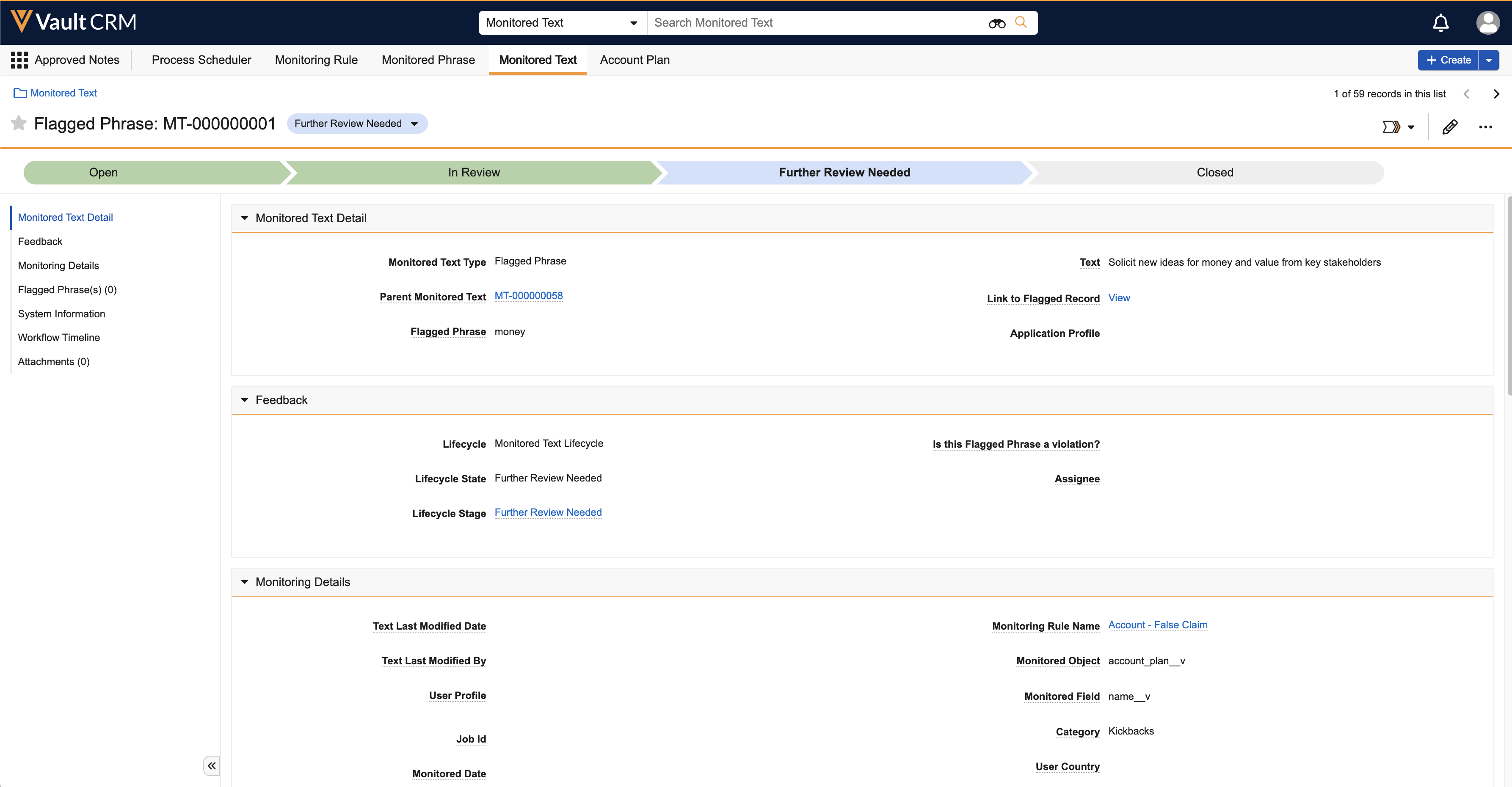 Using Vault’s native workflow capabilities, you can also customize the process by setting up email notifications to alert compliance users based on specific conditions. For example, notifications can be sent when a monitored text record is open and has not been modified for two days, or if the record is assigned to a specific user and falls under a designated category like “kickback__v.” For more on workflows and potential customizations, see Configuring Object Workflows on the Vault platform help site. |
