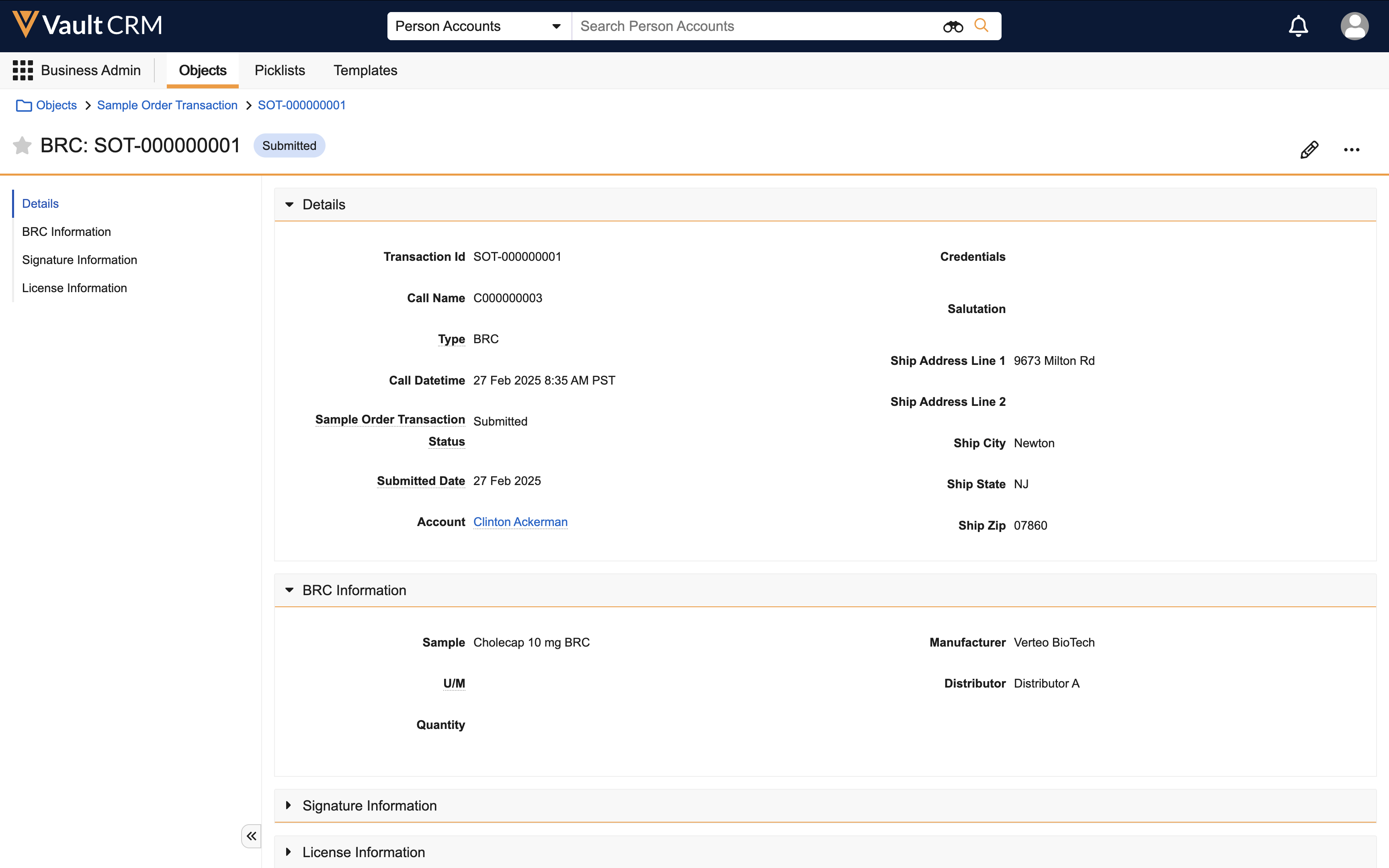 When you accept a signature from an HCP, data about the signature, including the time and date you captured it, is stored in Vault CRM for auditing purposes. Your admins can easily view your call and sample transaction records to make sure your sampling activities meet compliance regulations.