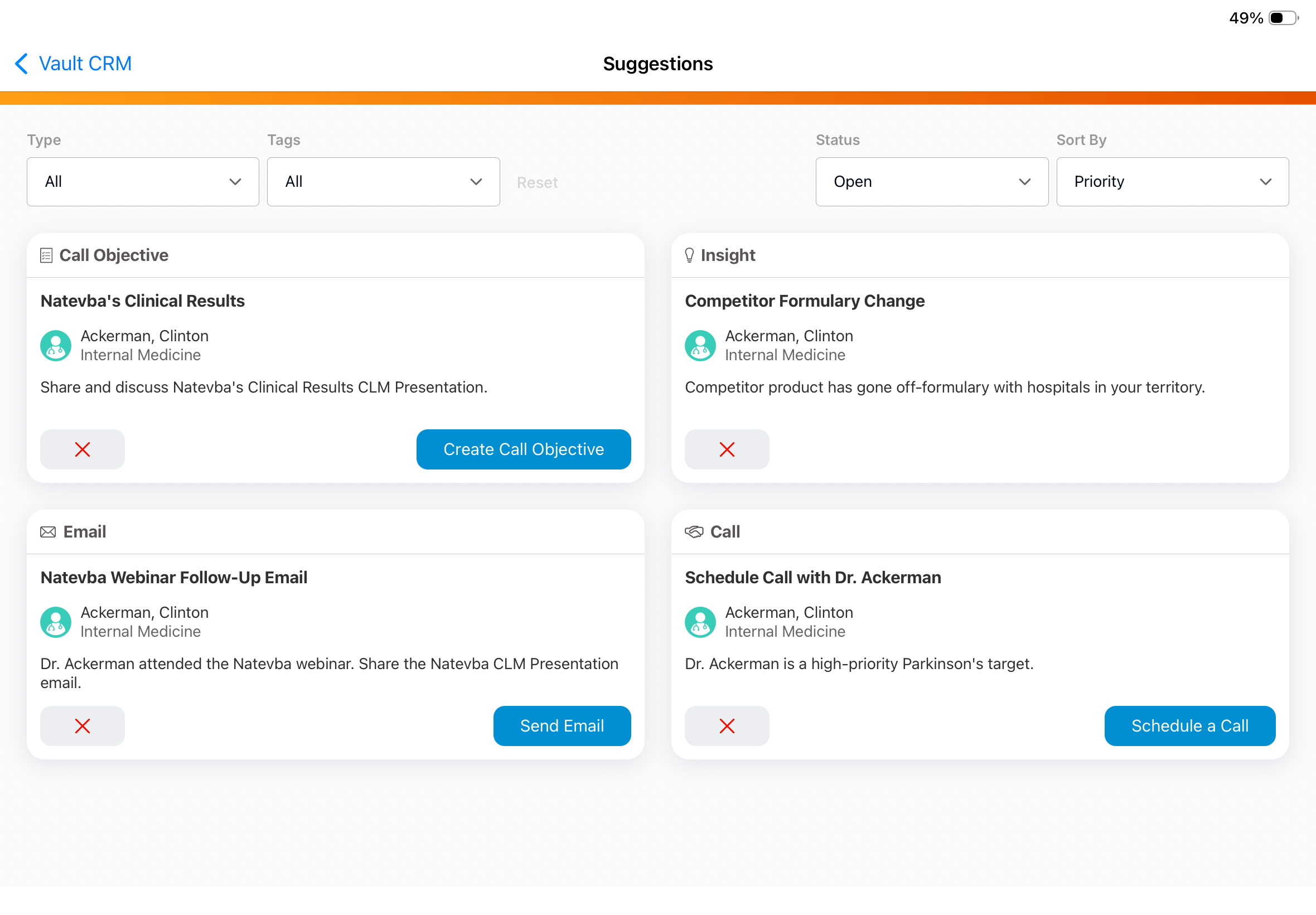 Call Objective - Recommends a specific task or topic to address during the field user’s next interaction with the associated account. Call Objective Suggestions can also include relevant CLM material to prepare them for their next interaction. Other common use cases for the Call Objective type include: